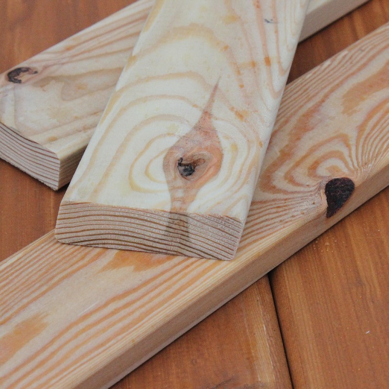 Die Rhombusleisten in B-Sortierung aus sibirischer Lärche sind kammergetrocknet mit 14%(± 2%) Restfeuchte und allseitig glatt gehobelt.